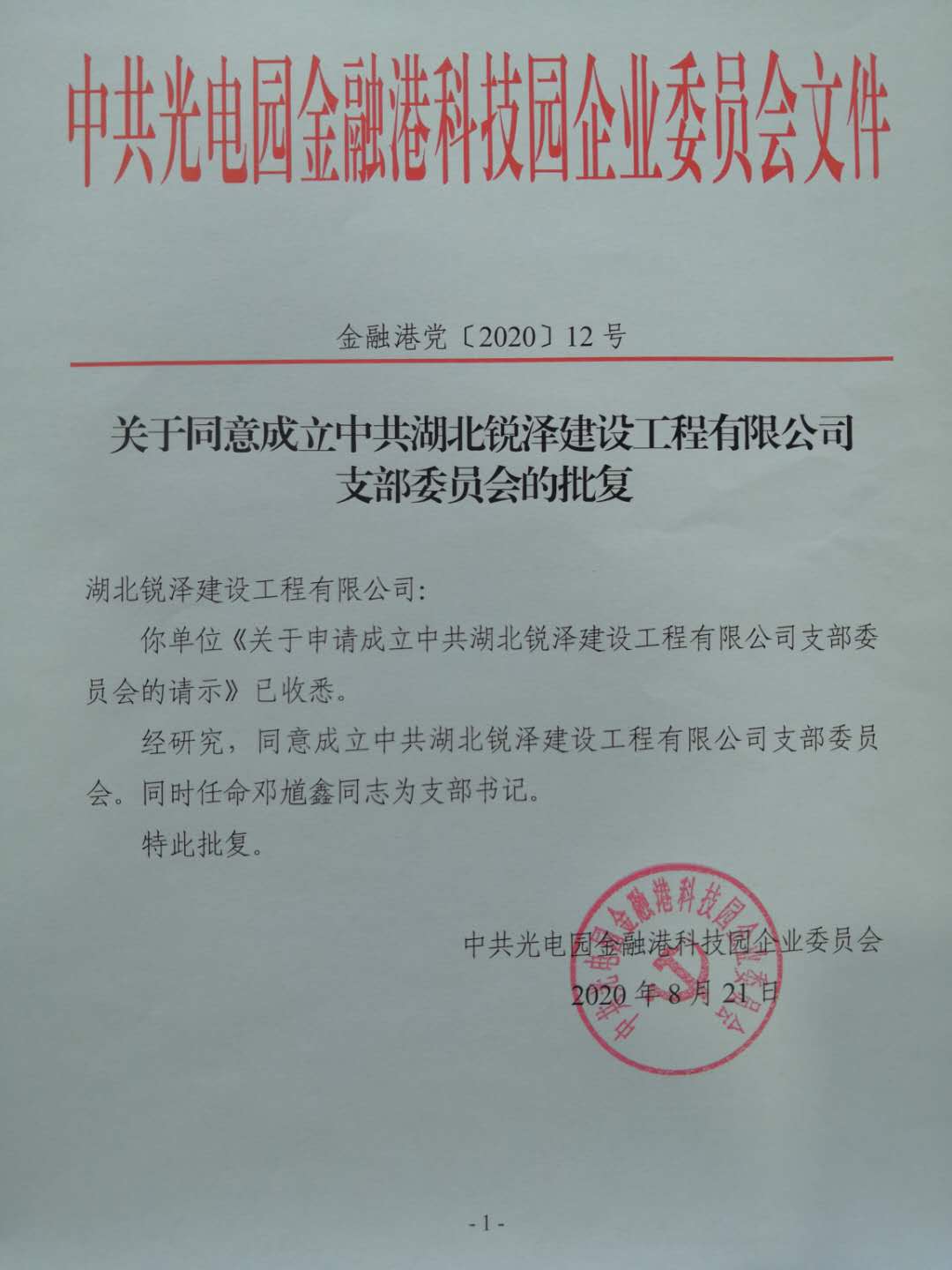 2020年8月21日,经中共光电园金融港科技园企业委员会批复,同意成立中共湖北锐泽建设工程有限公司支部委员会,同时任命邓馗鑫同志为支部书记!