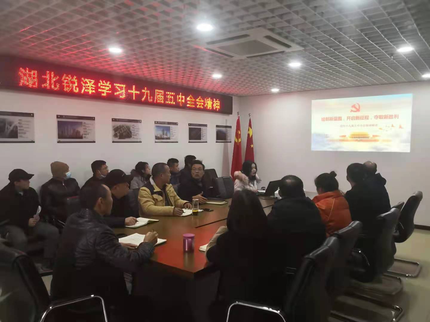 2020年12月15日,湖北锐泽全体党员及部分群众在会议室召开了关于党的十九届五中全会精神解读的主题会议。集中学习党的十九届五中全会精神,进一步学习习近平总书记近期系列重要讲话精神,统一思想认识,凝聚发展共识,深入推进企业改革发展党建各项工作。