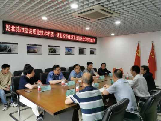 2021年5月15日上午,湖北锐泽建设工程有限公司和湖北城市建设职业技术学院在公司会议室召开校企合作会议。参会人员有公司总经理夏全刚,副总经理、技术总工、党支部书记邓馗鑫,办公室主任陈先锋和物资部经理张斌;湖北城市建设职业技术学院纪委书记胡俊、建筑管理学院院长李方峻、建筑设计学院院长高卿、建筑管理学院副书记徐荣坤和建筑工程学院教授刘水林。