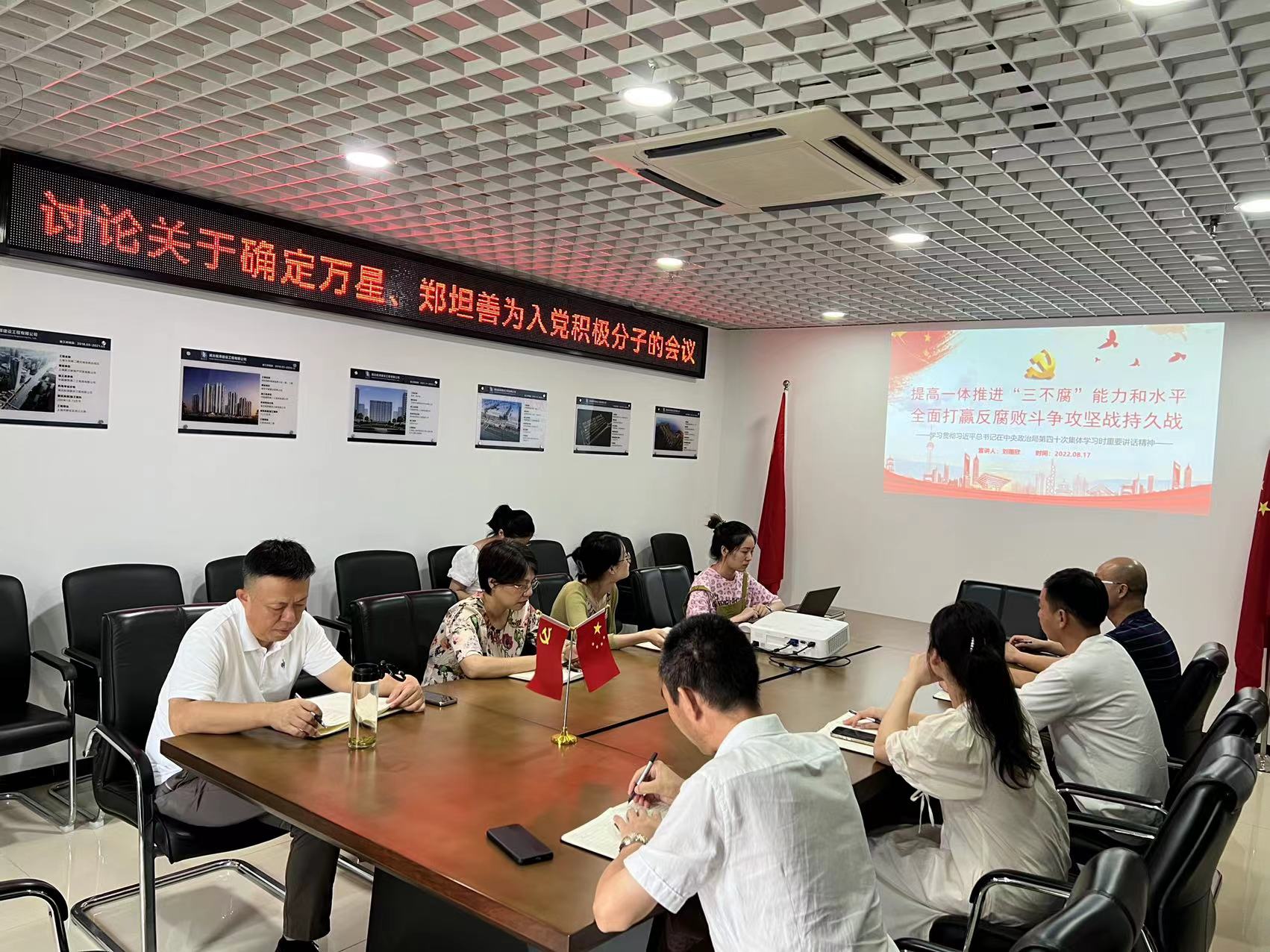 2022年8月17日上午9点,湖北锐泽党支部在会议室召开了《提高一体推进“三不腐”能力和水平,全面打赢反腐败斗争攻坚战持久战》廉政党课学习会议,学习贯彻习近平总书记在中央政治局第四十次集体学习时重要讲话精神,并组织讨论确认万星、郑坦善同志为入党积极分子会议。